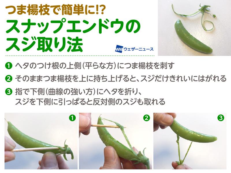 「スナップエンドウはスジがしっかりしているため、つま楊枝を使うときれいに取ることができます。手順は次の通りです」