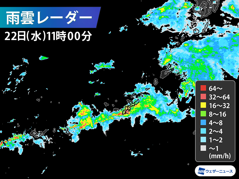 今日22日(水)の10時30分までの1時間に、那覇空港では1時間で32.0mmの激しい雨を観測しました。