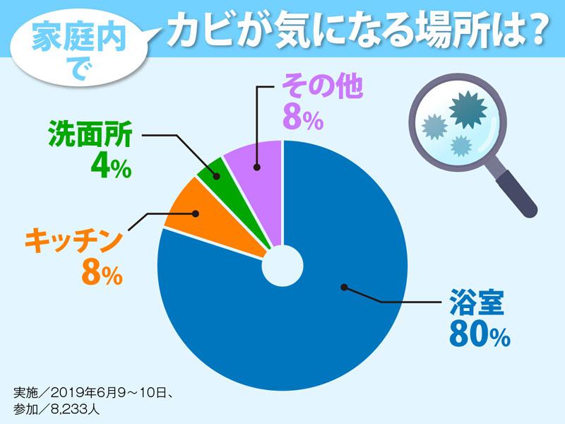 以前にウェザーニュースで「家庭内でカビが気になる場所は?」というアンケート調査を実施したところ、「浴室」と答えた人が80%を占め、2位の「キッチン」(8%)以下を大きく引き離していました。