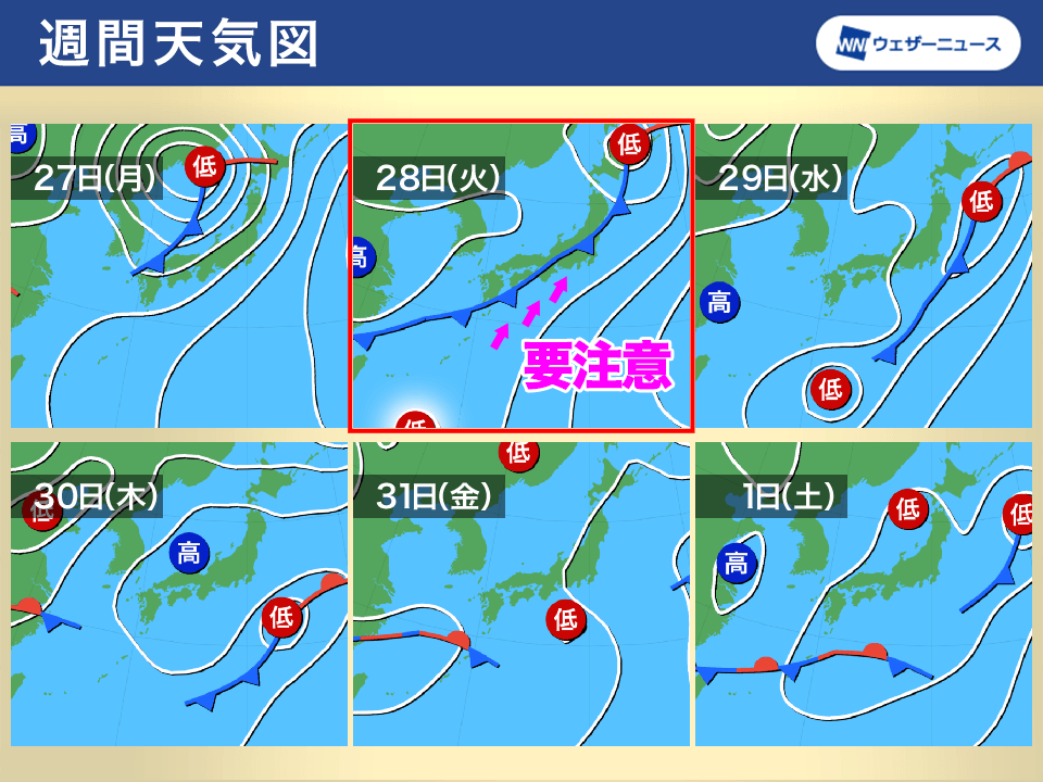 一方で、台風の北上前の28日(火)頃には、東日本や西日本で前線による雨が予想されます。台風の東側にある湿った空気が前線に向かって流れ込むため、このタイミングで前線の活動が活発になる可能性があります。