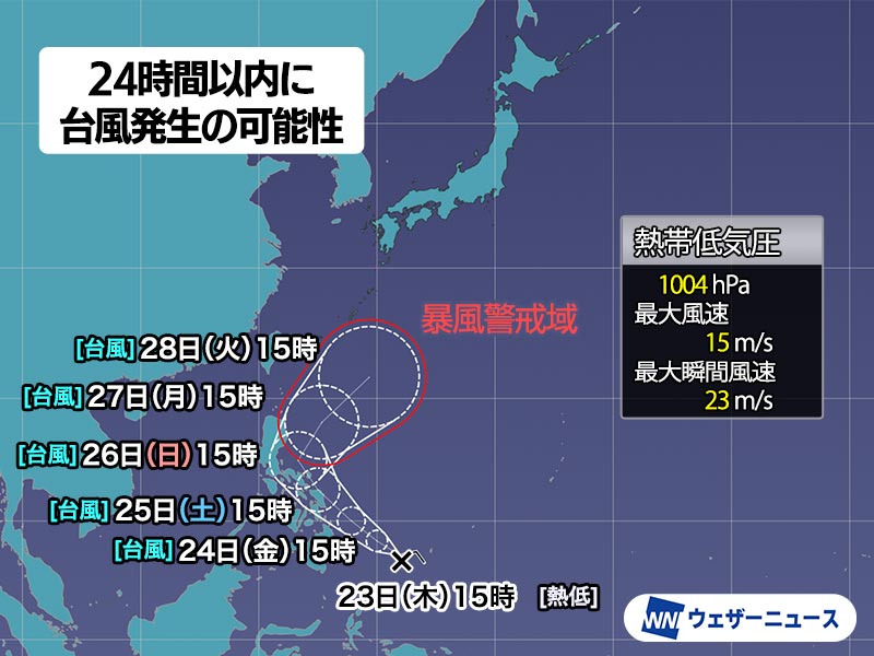 今朝3時に発生したこの熱帯低気圧は、今後勢力を強めて台風に発達する予想です。その後も発達を続け、4日先の27日(月)頃になると暴風域を伴う勢力に発達することが予想されています。