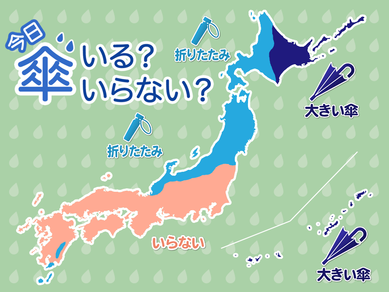 北海道の日本海側は午前中を中心に雨の降ることがあります。東北も一時的に雨の降るところがあるため、外出には折りたたみ傘をお持ちください。
