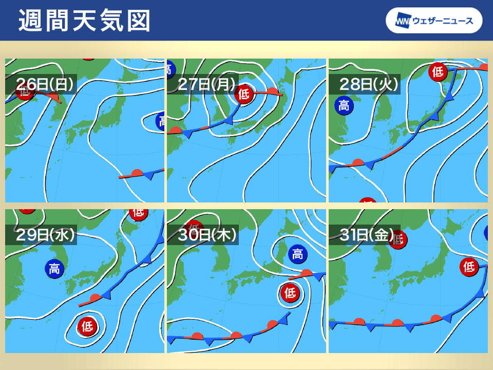 また、台風の北上前の27日(月)〜28日(火)頃は東日本や西日本で前線による雨が予想されますが、この熱帯低気圧から変わる台風の周囲をまわる湿った空気が流れ込むと、前線の活動が活発になる可能性があります。台風が離れていても雨の情報にご注意ください。