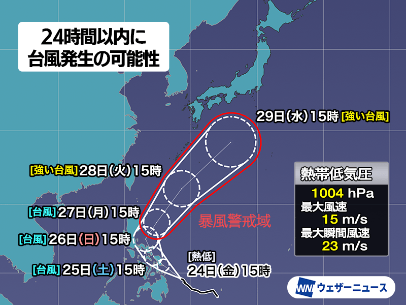 この熱帯低気圧は今後勢力を強めて台風に発達する予想です。その後もさらに発達を続け、3日先の27日(月)頃には暴風域を伴い、4日先の28日(火)頃には“強い”勢力の台風に発達することが予想されています。
