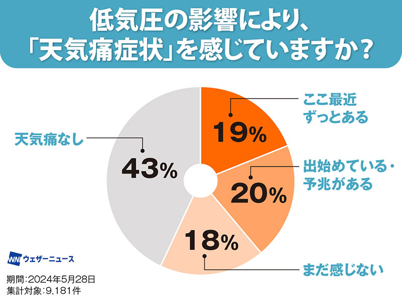 頭痛や肩こり、だるさなどの兆候はないでしょうか? ウェザーニュースが実施した天気痛の症状に関するにアンケート調査では、「ここ最近ずっとある」が19%、「出始めている・予兆がある」が20%という結果で、約4割の人が症状を感じているようです。