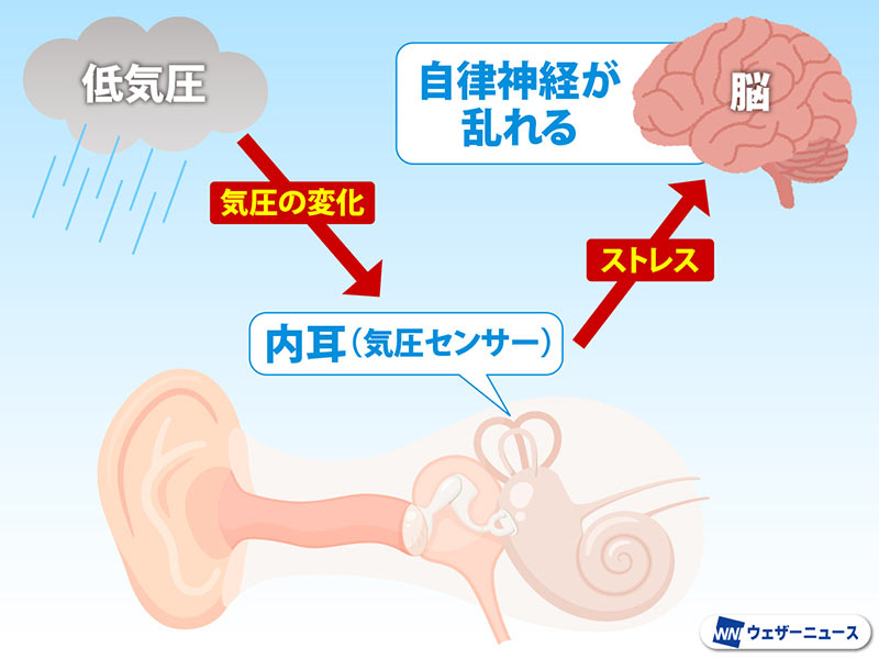 そして耳の鼓膜の奥にある内耳には、気圧の変化を感じとる“気圧センサー”があります。気圧の変化を察知すると、情報が脳にストレスとして伝わり、自律神経に影響を与えます。