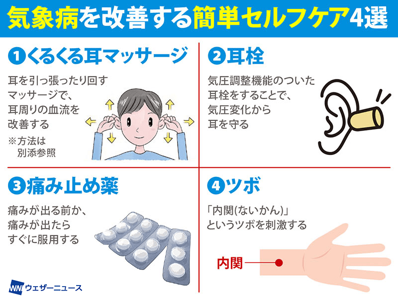 「天気が変わるとき、気温や湿度、気圧などが変化しますが、体がそれらの影響を受けるのです。気象病の代表ともいえるのが、頭痛や関節痛、腰痛など慢性的な痛みが天気で悪化する『天気痛』です。人によっては、めまいや耳鳴り、食欲がない、眠気、体がむくむ、ぜん息が悪化する、うつ傾向になり塞ぎ込む、などもあります。