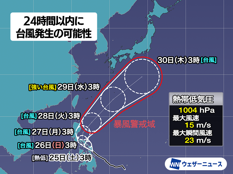 台風の北上前の27日(月)〜29日(水)頃には、東日本や西日本で前線による雨が予想されますが、この熱帯低気圧から変わる台風の周囲をまわる湿った空気が流れ込むと、前線の活動が活発になる可能性があります。