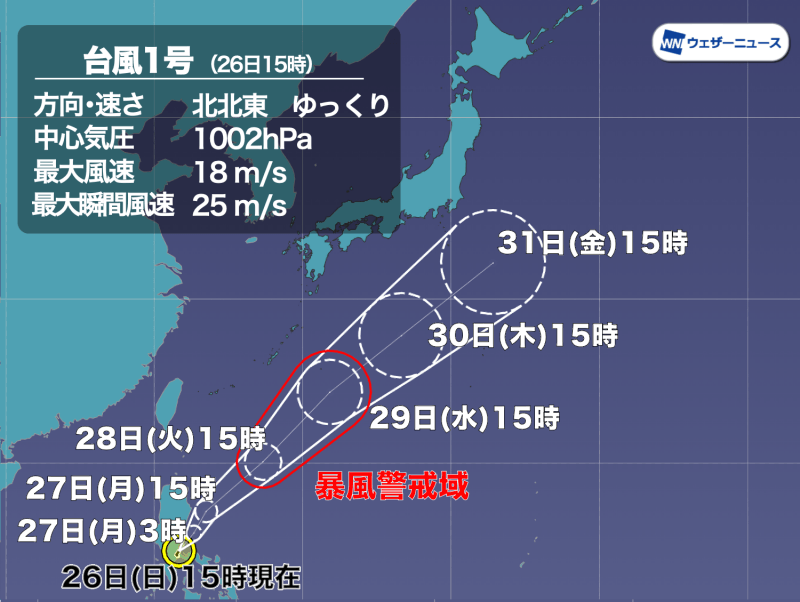 台風1号は今後も発達を続け、28日(火)頃には暴風域を伴うことが予想されています。その後は北上によって海水温の低い領域に達することなどで、次第に勢力を落とします。