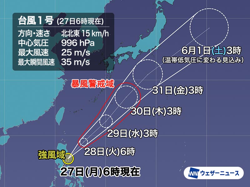 台風1号はこのあとも北東方向に進み、本州の南を通過していく見込みです。沖縄県の大東島地方や、東京都の伊豆諸島などに接近するおそれがあります。風雨の強まりへの備えを進めるようにしてください。