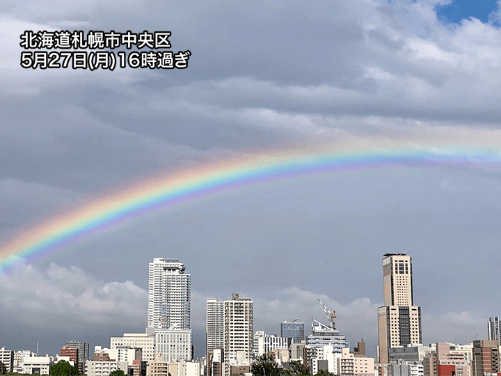 今日27日(月)の北海道は前線の影響で雨の所が多くなっています。雨雲が東に抜けて日が差し込んだ札幌では虹が現れ、一部では過剰虹と呼ばれるものが見えました。