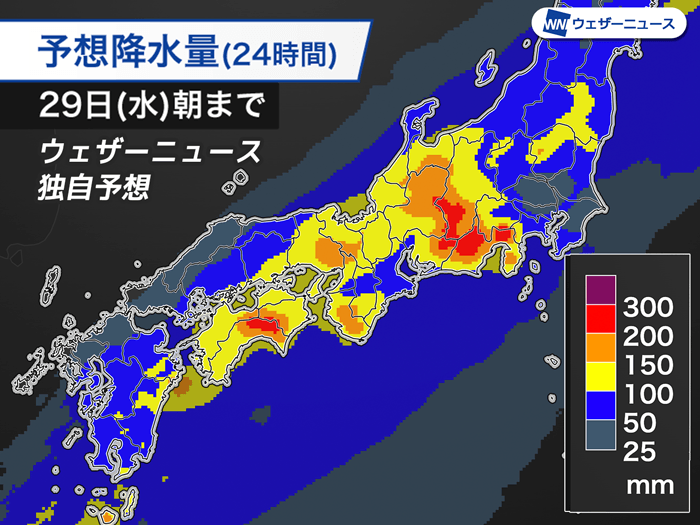 明日朝までに予想される降水量は、西日本や東日本の広範囲で100mmを上回る予想です。特に、南からの湿った空気が山にぶつかるなどして雨雲が発達しやすい四国や近畿、東海の山沿いでは、総雨量が200mmを超えるおそれがあります。