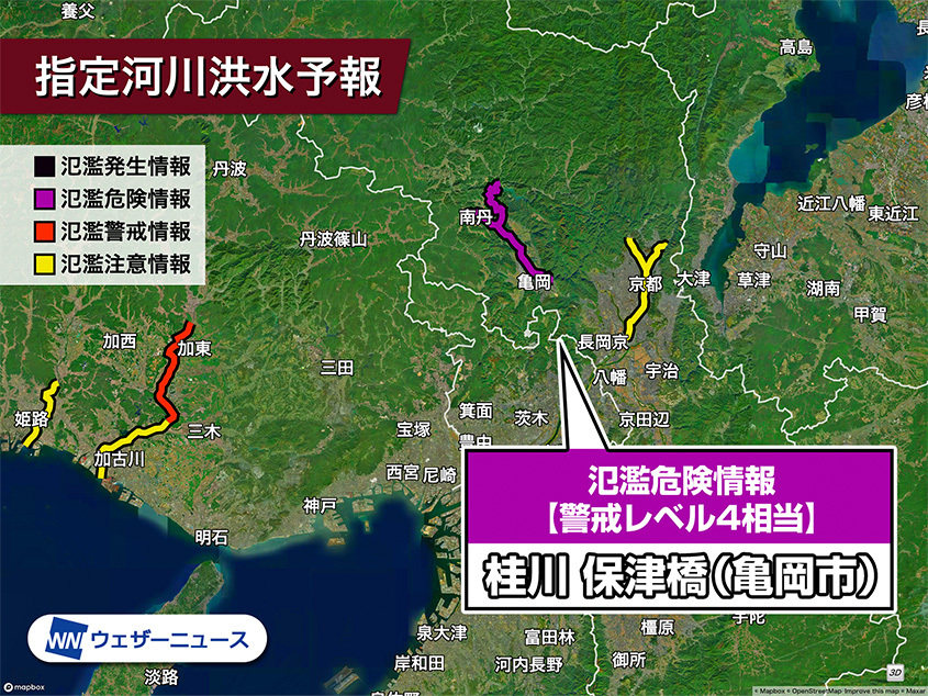 大雨の影響で京都府を流れる桂川中流・園部川(そのべがわ)が増水し、氾濫危険情報(警戒レベル4相当)が発表されました。