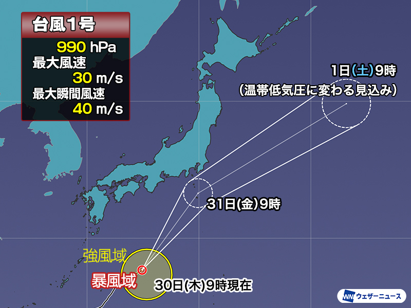 台風1号は、勢力を弱めながら北東に進む予想です。