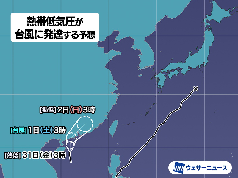 ただし、この熱帯低気圧周辺の湿った空気の影響で梅雨前線の活動が活発になる可能性があり、6月2日(日)〜3日(月)頃に沖縄で雨が強まる可能性があります。今後の情報にご注意ください。