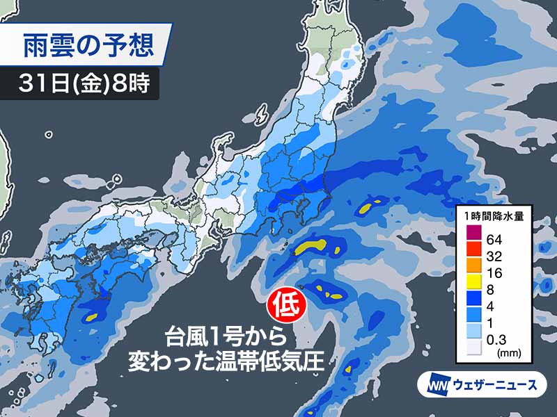 台風1号は温帯低気圧に変わりましたが、周辺では最大風速20m/sの台風並みの風が吹いています。伊豆諸島では昼頃にかけて、強い雨や強風に注意が必要です。高波にも警戒してください。