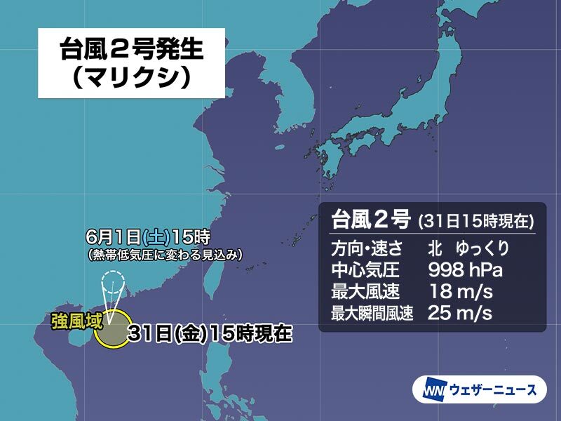 ただし、沖縄付近に停滞する梅雨前線に向かって台風由来の湿った空気が流れ込むため、6月2日(日)から3日(月)にかけて前線の活動が活発化し、大雨となる可能性があります。今後の情報にご注意ください。