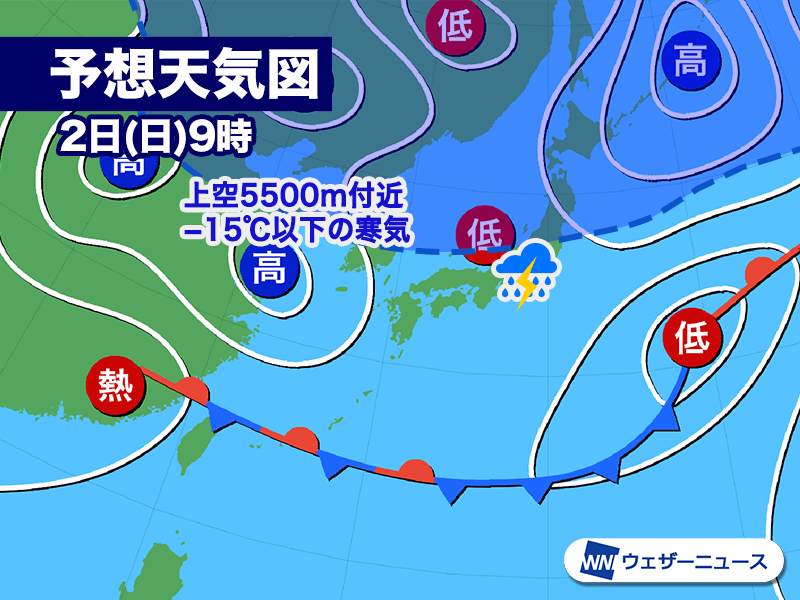 上空の強い寒気が南下 日曜日から週明けは激しい雷雨のおそれ