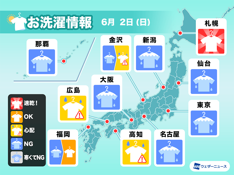 今雨の降っていないところでも天気が急変する可能性があり、土砂降りになることも考えられるため軒下での外干しも注意です。今日は部屋干しが良さそうです。