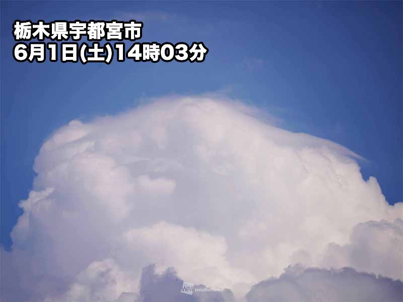 宇都宮市からは「頭巾雲」の報告が到着しました。「頭巾雲」とは「ベール雲」とも呼ばれ、入道雲の上部にかかるベールのような薄い雲を指します。発達している最中の入道雲(雄大積雲)の雲頂付近にできる雲で、頭巾雲が発生するということは、雲が強い上昇流を伴って急成長している証拠になります。