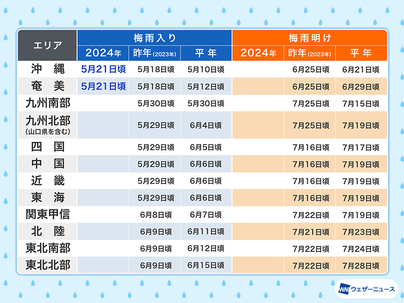 梅雨前線の予測には不確実性がありますが、ウェザーニュースの予想では、九州南部〜東北の各地では今年の梅雨入りが6月中旬になるとみています。7月にかけて雨の季節となりますので、雨の日用のグッズの準備や大雨対策などを進めるようにしてください。