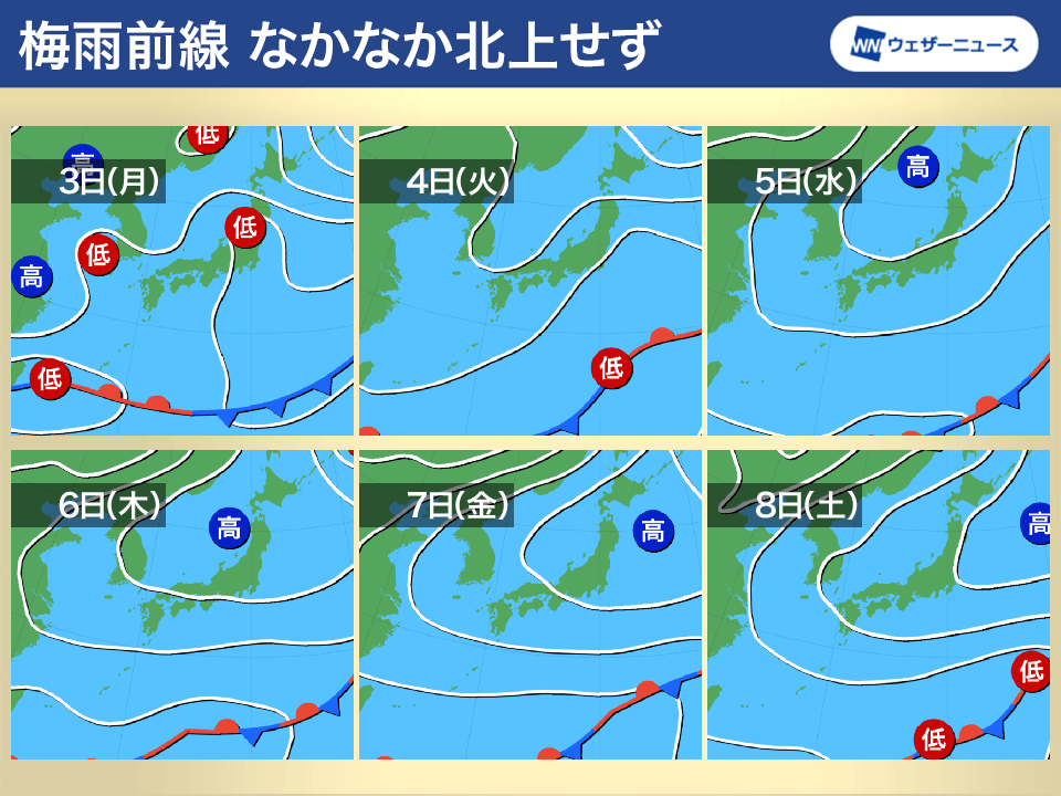 この先1週間ほどは梅雨前線が北上せず、沖縄よりも南に停滞する日が多くなる予想です。