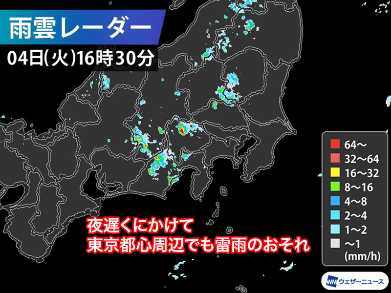 東京都心周辺などでも夜遅くにかけて雨が強まり、雷を伴うおそれがあるので注意が必要です。帰宅の際は天気の急変にお気をつけください。
