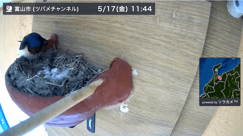6/5(水)現在、ソラカメ™設置は925か所を突破。そんな中、富山にはツバメの成長を見守るソラカメ™が設置されました!先日5/17(金)〜19(日)までにはかわいいヒナが4羽誕生。無事大きくなることを祈りつつその成長をみんなで見守ってきましたが・・・ついに!6/6(木)の朝、巣立ちとなりました。
