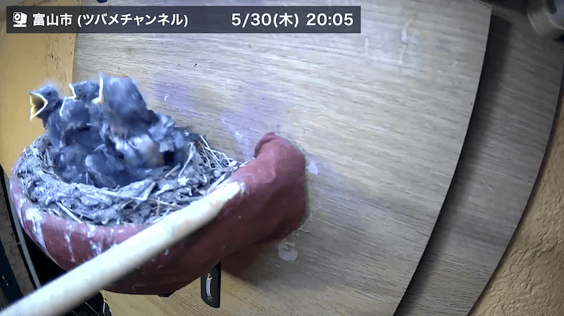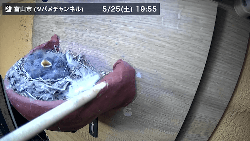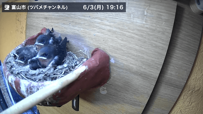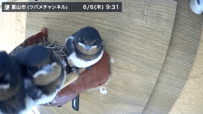 なお、巣立ってもしばらくは親ツバメと過ごし、その間に飛び方やえさの獲り方などを学びます。ただ巣には戻ってこないため、本ソラカメ(ツバメチャンネル)は6/6で一旦休止となります。