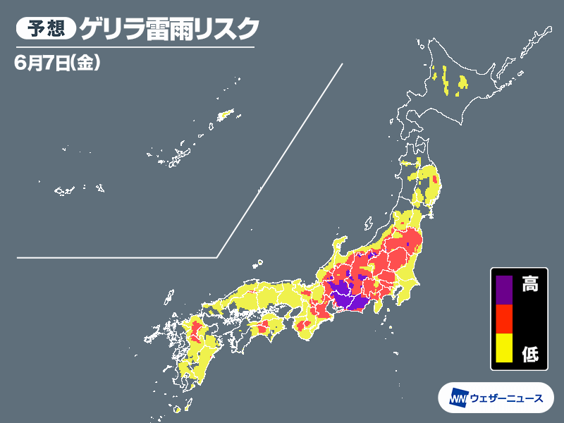 ゲリラ雷雨の発生リスクマップでも、一部の地域では最も高い紫色のエリアが分布している状況です。