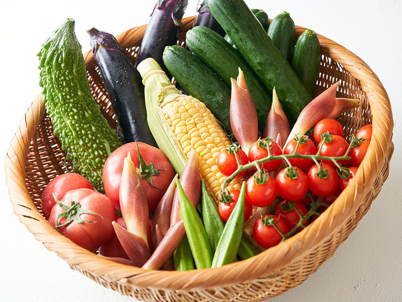 夏野菜には、暑い夏を乗り切るための栄養素、ビタミン類やカリウム、β-カロテンが多く含まれています。ビタミン類は疲労回復や免疫力を高め、夏バテ予防や改善に効果があるとされ、β-カロテンは粘膜や皮膚を丈夫にする働きがあると言われています。