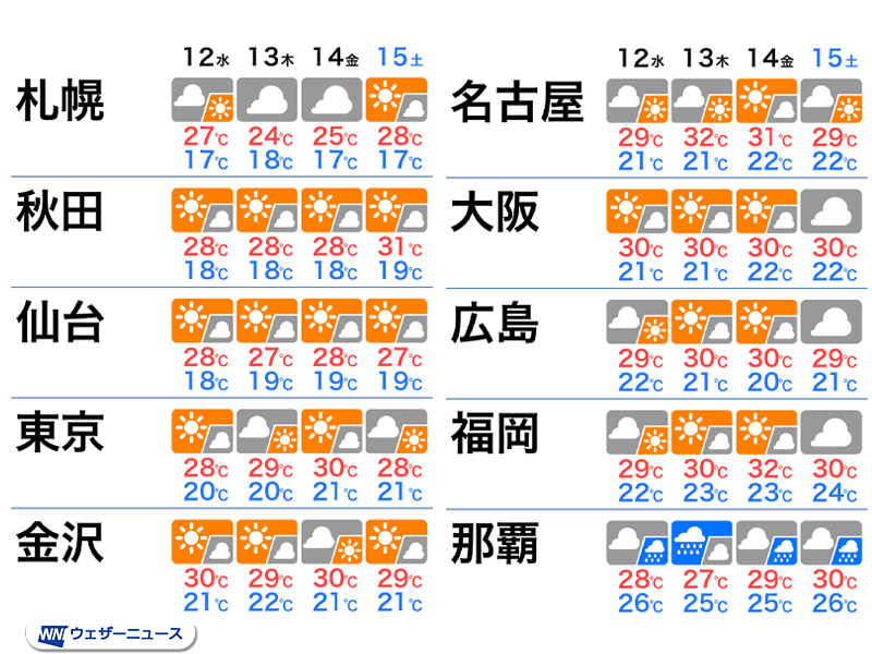 西日本や東日本は13日(木)〜14日(金)頃が暑さのピークになり、名古屋市の32℃など各地で30℃以上の真夏日になる見込みです。東北は晴れる日が多いため連日30℃前後となり、秋田市は15日(土)に31℃の暑さが予想されます。札幌市でも晴れる日は25℃を超える夏日になる見通しです。