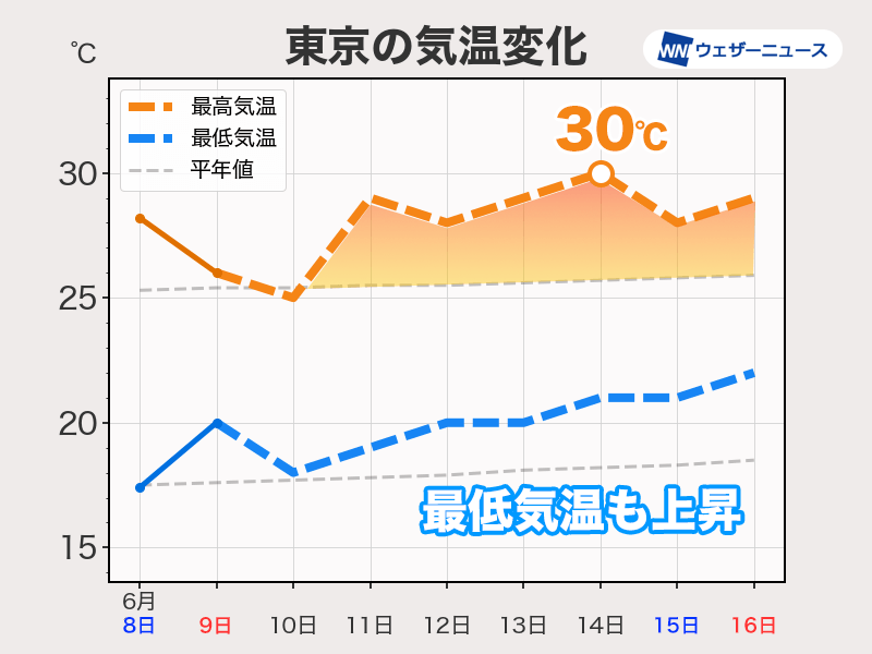 最高気温は25℃を大きく上回って、14日(金)には30℃まで上がる見込みです。最低気温が高くなることも特徴的で、週後半は21〜22℃くらいが予想されます。