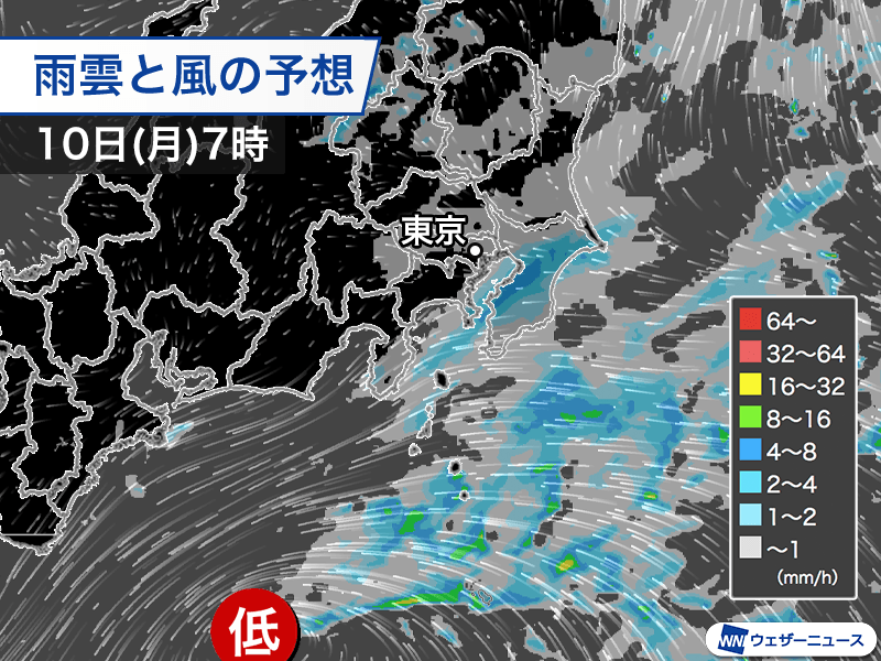 今日9日(日)、西日本に雨を降らせている低気圧は本州の南の海上を東進し、関東では今夜遅くから広い範囲で雨が降り出します。