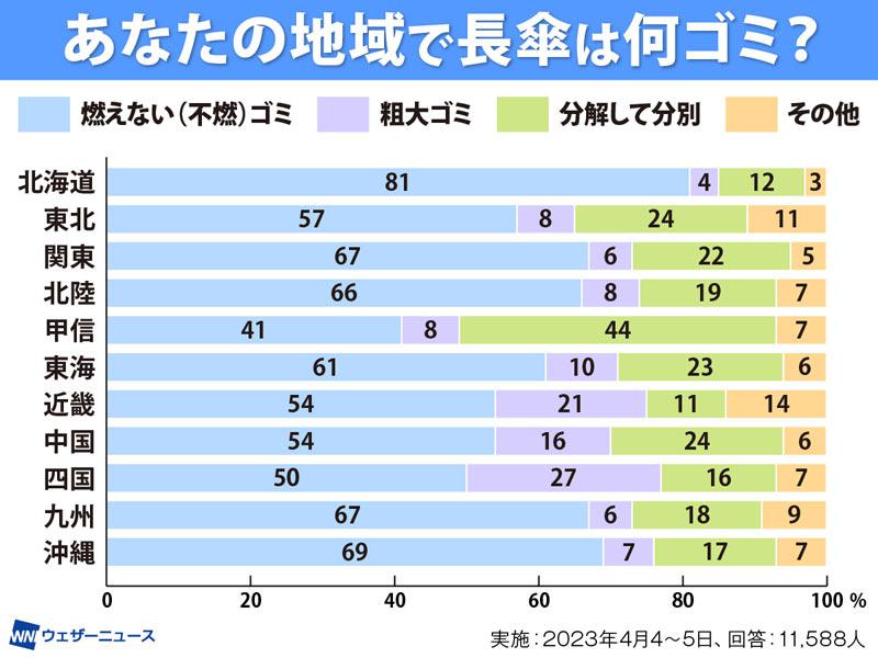 2023年4月4日〜5日にウェザーニュースで「あなたの地域で長傘は何ゴミ?」というアンケート調査を実施したところ、「燃えない(不燃)ゴミ」が過半数となるエリアが多くなりました。