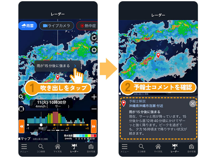 「現在地ボタン」と「予報士コメント」を活用しよう