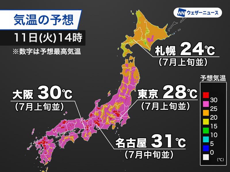 関東から九州にかけては30℃前後の予想で、各地の最高気温は東京や福岡で28℃、名古屋31℃、大阪30℃となっています。