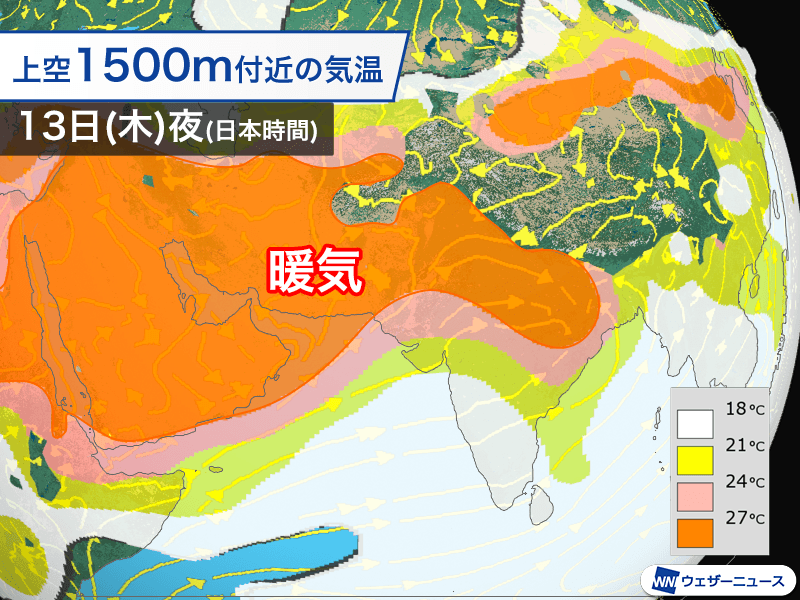 上空1500m付近で+27℃以上の非常に暖かな空気が中東からインド北部にかけて分布しています。ここ数日は暖気がインド北西部だけでなく北東部にまで広がり、熱波がぶり返している状況です。