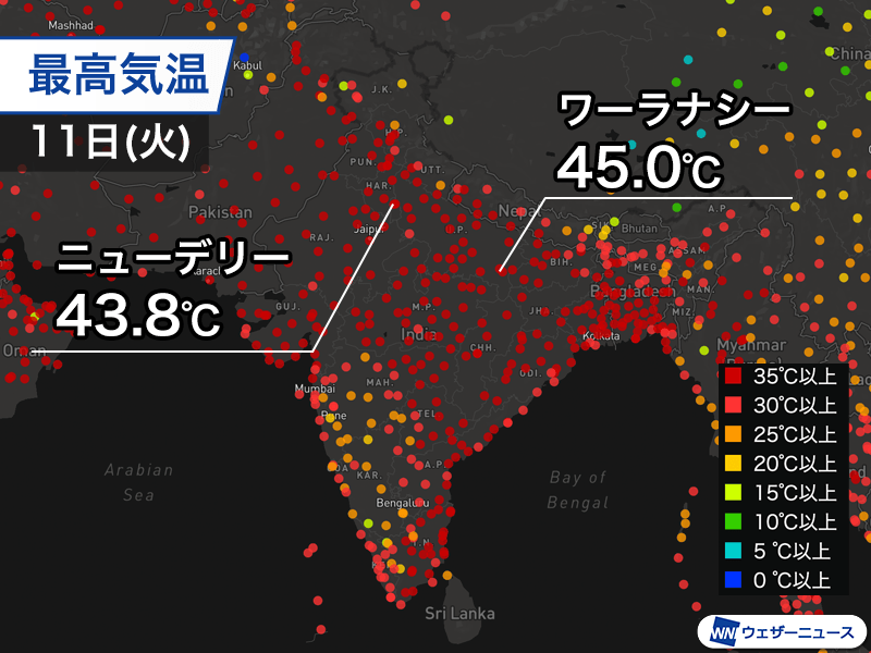 北東部では13日(木)頃に暑さのピークとなって、場所によっては50℃近い猛烈な暑さが予想されています。ニューデリーをはじめとした北西部は45℃前後の暑さが当面、継続する見込みです。