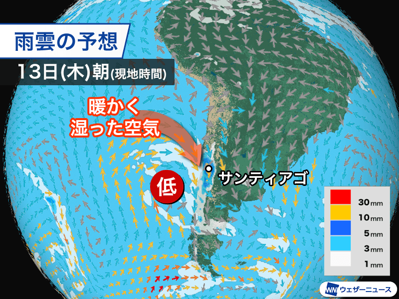 現地時間の13日(木)の夜にかけて、首都サンディアゴを含むチリ中部を中心に断続的に雨が強まり、広い範囲で50mm以上、局地的には100mmを超えるような大雨が予想されます。