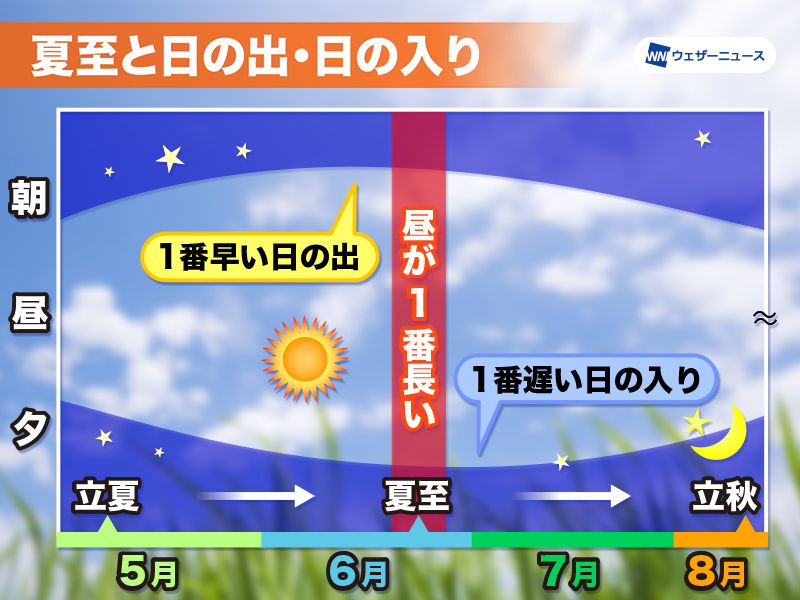 日の出は夏至の少し前が最も早く、日の入りは夏至の少し後が最も遅い