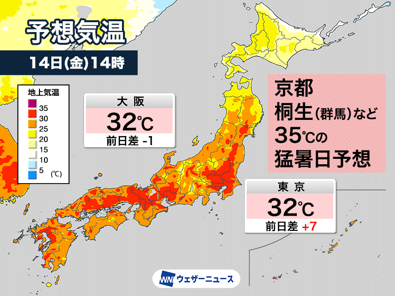 東北〜九州にかけての各地は高気圧に覆われて晴れる所が多く、平年のこの時期と比べるとかなり気温が高くなります。最高気温が30℃以上の真夏日になる所が多く、京都や桐生(群馬)など近畿や関東の内陸の地域では35℃以上の猛暑日になる可能性もあります。