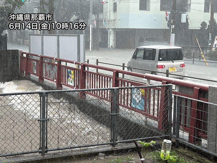 この雨によって那覇市内ではあちらこちらで道路が冠水し、中小河川は急激に水位が上昇しています。強雨のピークは過ぎつつあるものの、しばらくは移動を避け、やむを得なく移動をする場合も周囲の状況をしっかりと確認して安全を確保するようにしてください。