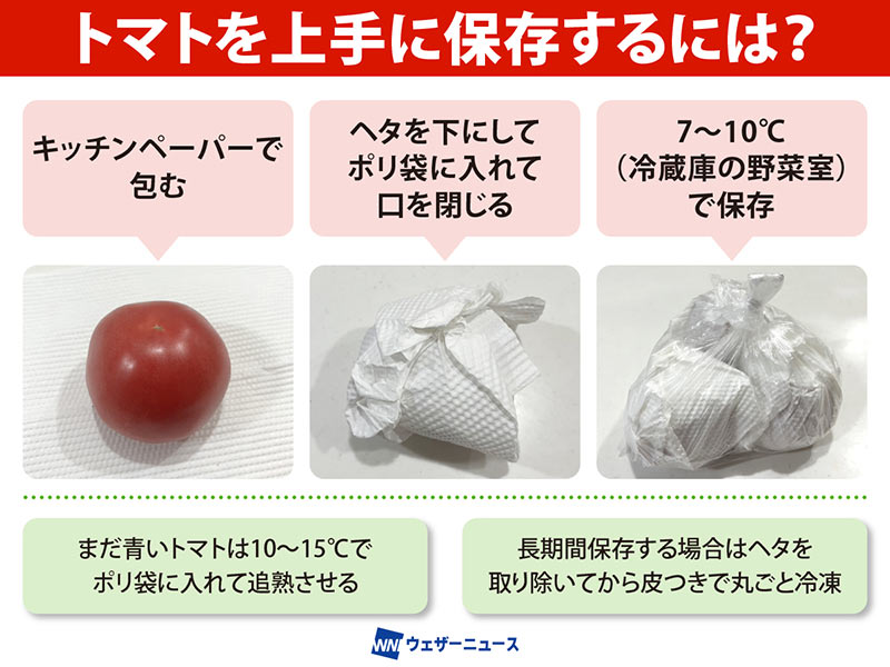 そこで、まだ青いトマトは追熟させながら保存、赤いトマトは過度に追熟しないように鮮度を適度に保ちつつ保存する必要があります。