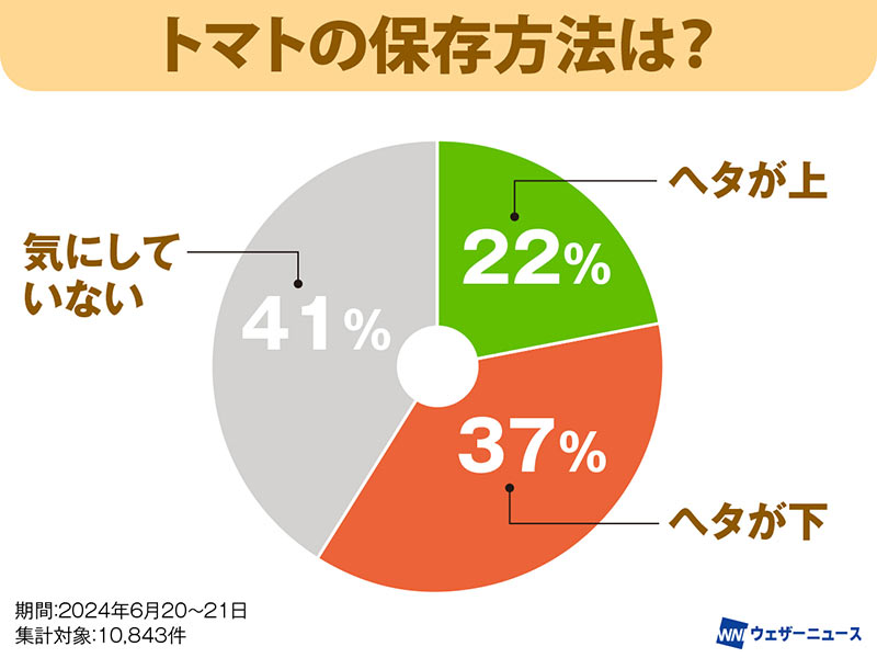 このときヘタを下にします。トマトはヘタの周りの果肉が固いので、ヘタを下にした方が圧迫に強く傷みにくいためです。こうして何日かすると赤くなり、甘みが出てきます。