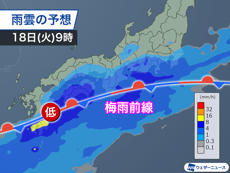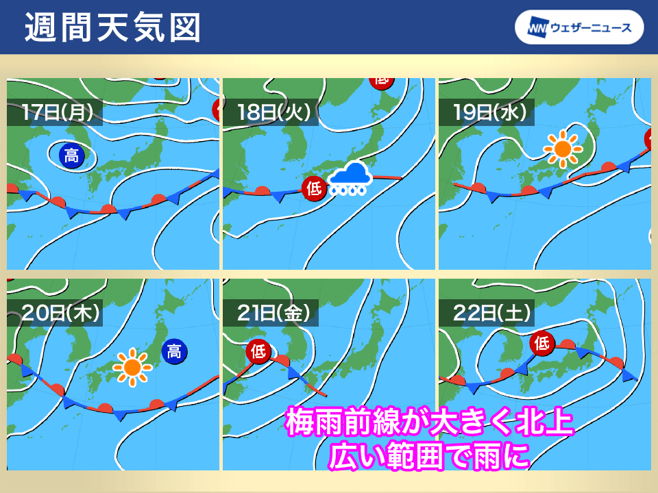 梅雨前線の動向 18日(火)の予報悪化 次の週末までに各地で梅雨入りか