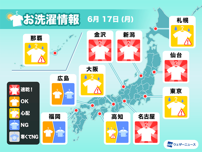 東北や北陸、東海では気温が高いので外に干した洗濯物は早く乾く予想です。