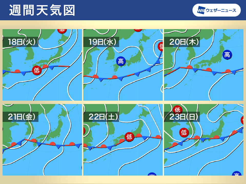 週明けの18日(火)にかけて前線が北上して西日本や東日本は天気が崩れる見込みです。その後、週の中頃にはいったん前線が離れ、全国的に晴天となります。