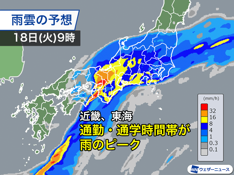 低気圧が通過するタイミングに最も雨が強まり、明日朝の通勤・通学時間帯は近畿や東海が雨のピークになる見込みです。普段よりも移動に時間がかかる可能性がありますので早めに準備を行い、可能ならば雨のピークとずらして移動をすることもご検討ください。