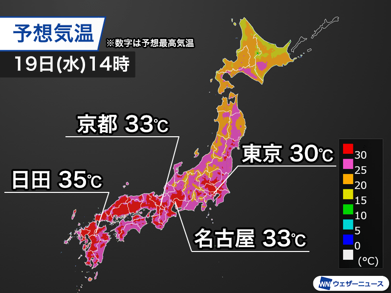 早くから暖かな空気に覆われて西日本は内陸部を中心に気温が上がりやすく、大分県日田市や広島県安芸太田町・加計では最高気温は35℃と猛暑日。京都市や名古屋市は33℃の予想となっています。